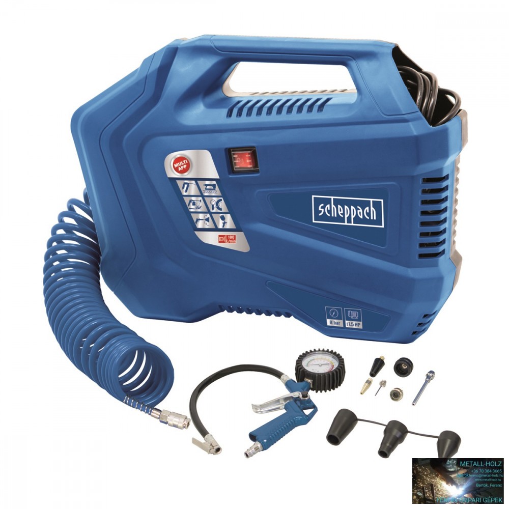 A Scheppach AIR FORCE 3 kompresszor egy nagyon praktikus, helytakarékos, könnyű, erős és sok funkcióval ellátott gép, amely kiváló segítség minden háztartásban, hétvégi házban, lakókocsiban vagy hajón. A nagyon sok, különböző csatlakozónak köszönhetően, könnyedén megbírkózik a motor, autó és kerekpár gumijával, a labdák, matracok, csónakok stb. felfújásával is. Az összes tartozék, a hálozati kábellel, a minőségi, 3 m hosszú nagynyomású tömlővel, a manométeres pisztollyal és a kilenc különböző csatlakozóval együtt, nagyon ügyesen van elhelyezve a kompresszor belsejében, így semmi sem vész el. A kényelmes markolat megkönnyíti a gép hordozhatóságát. A kompresszor a legmodernebb, olajmentes tehnológiával készült motorral van felszerelve. Az olajszint ellenőrzése, utánpótlása vagy cseréje teljesen szükségtelen, mert a kompresszor így is mindig készen áll a munkára. Mérete és összesen 5,5 kg súlya miatt használata ideális kempingezéshez vagy más szabadtéri tevékenységekhez.