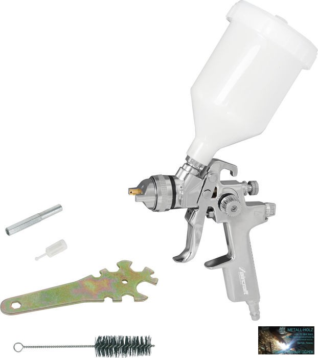 – Normál nyomású HVLP rendszerű festékszóró pisztoly; alacsonyabb porlasztási nyomásnak köszönhetően alacsonyabb a festékpermet és holtjáték