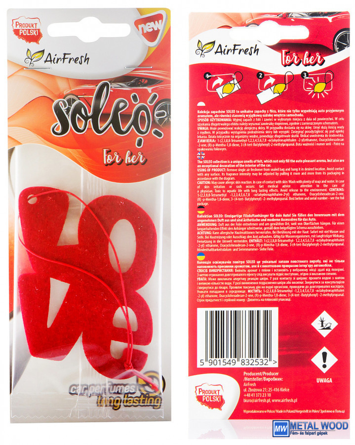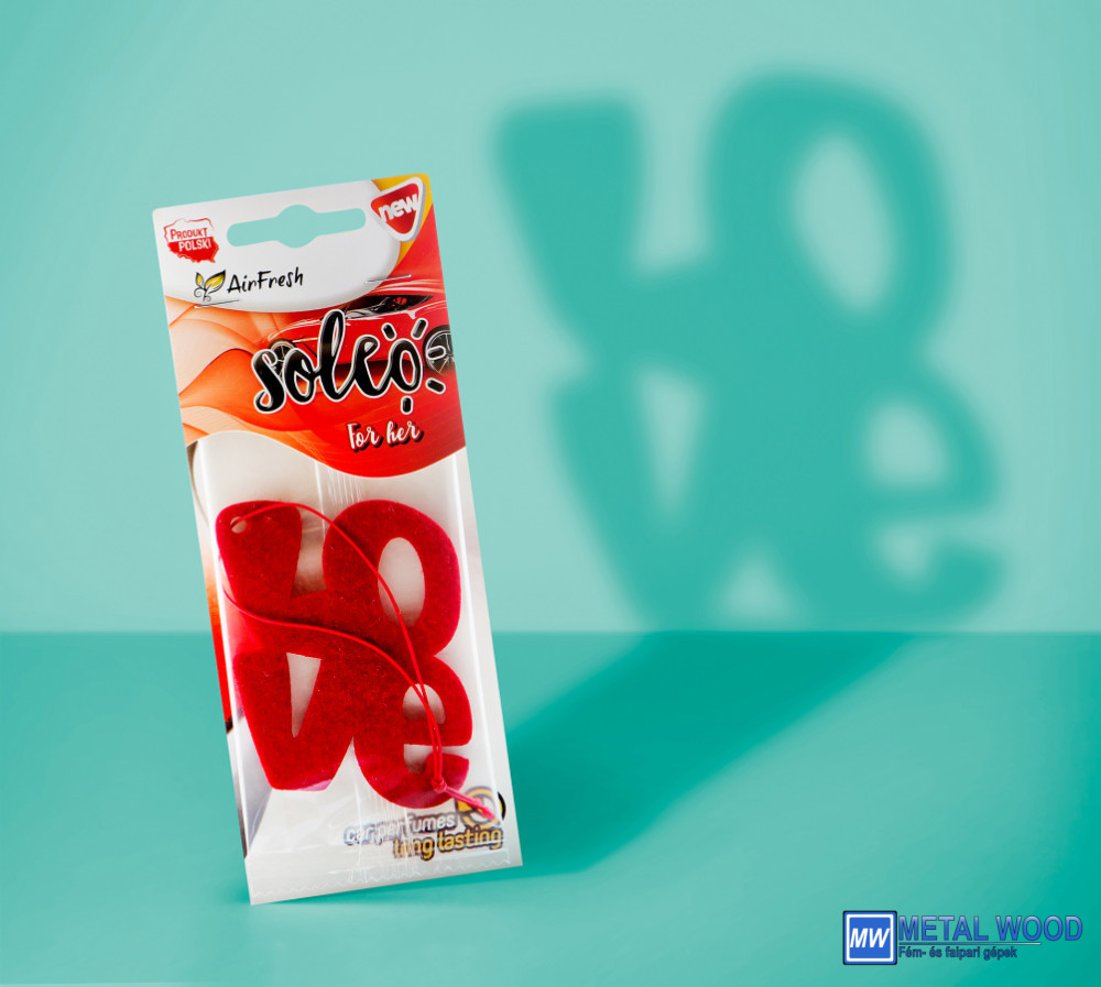 A Soleo illatok kollekciója egyedi filc illatpárnából készült, amelyek kellemes aromával töltik meg az autót, és emellett egyedi dekorációt jelentenek az autó belsejében.