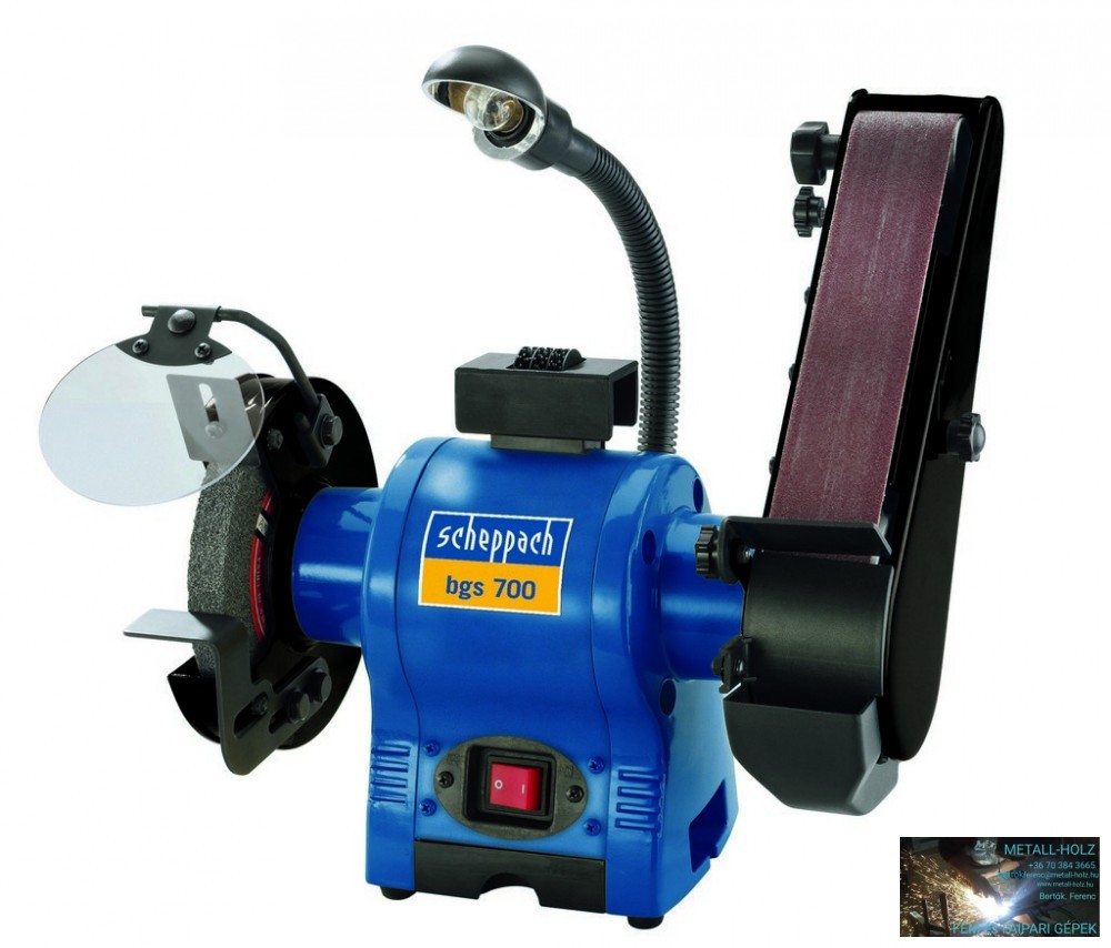 A BGS 700 kombinált csiszológép tökéletesen ötvözi két gép tulajdonságait. Ideális fém, fa és műanyagok csiszolásához. A gép alapja egy nagyon stabil fémkonstrukció, amely biztosítja a gép vibrációsmentes és kiegyensúlyozott működését. A karbantartásmentes gép és a nagyon halk indukciós motor garanciát nyújtanak a tökéletes végeredmény eléréséhez. A nagy, áttetsző védőburkolatok, amelyek védik a szemeit, minőségi anyagból készülnek, így mindig tökéletes, torzításmentes rálátást biztosítanak a megmunkált anyagra. A munkadarabtartók a köszörűkorongnál és a csiszolószalagnál egyaránt beállíthatók, így jelentősen meghosszabbítható a köszörűkorong és a csiszolószalag élettartama. A munkaterület megvilágítása csiszolás közben, ellengethetetlen kiegészítője a gépnek. Az integrált, nagy teljesítményű lámpa, egy flexibilis karon van elhelyezve, így az optimálisan beállítható a kívánt szögbe. A korong és a csiszolószalag védőburkolatai vízgyűjtőtálcaként szolgálnak, így a csiszolt anyag mindig megfelelően van hűtve, és nem változik meg annak fizikai tulajdonsága sem. A gép tartozéka egy durvább 150 mm-es korong és egy finomabb csiszolószalag. A korong első éleinek kiegyenlítését az integrált élkiegyenlítő biztosítja. A gép stabilitását négy gumírozott láb biztosítja, vagy csavarok segítségével rögzíthető a munkaasztalhoz is.