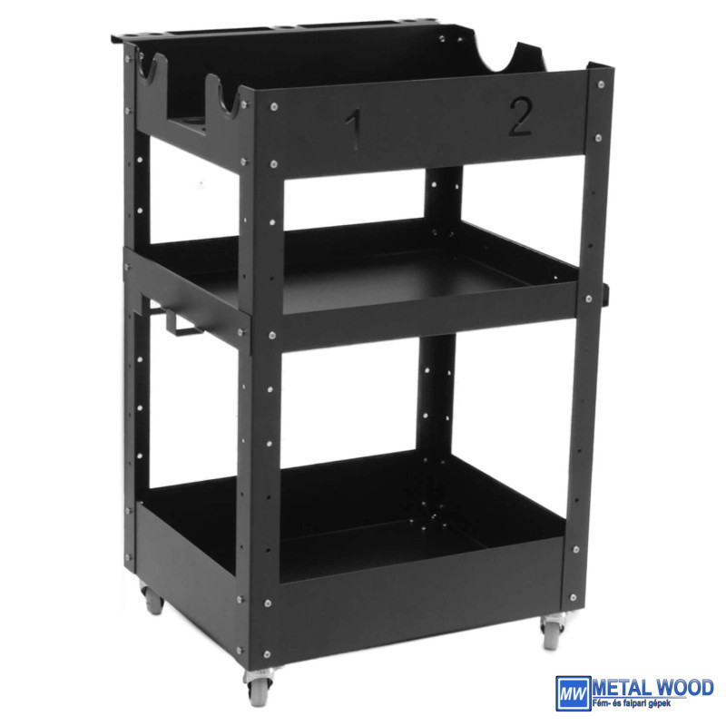 Gurulós professzionális kocsi jármű-előkészítéshez három funkcionális tárolási lehetőséggel. Kiváló minőségű horganyzott fémlemezből készült, és rengeteg tárolóelemet kínál, amelyek megkönnyítik mindennapi munkáját. Polcai egyenként 10,5 cm magas oldalfallal vannak felszerelve.