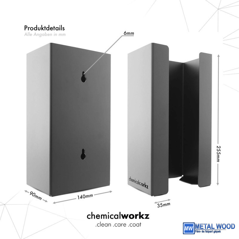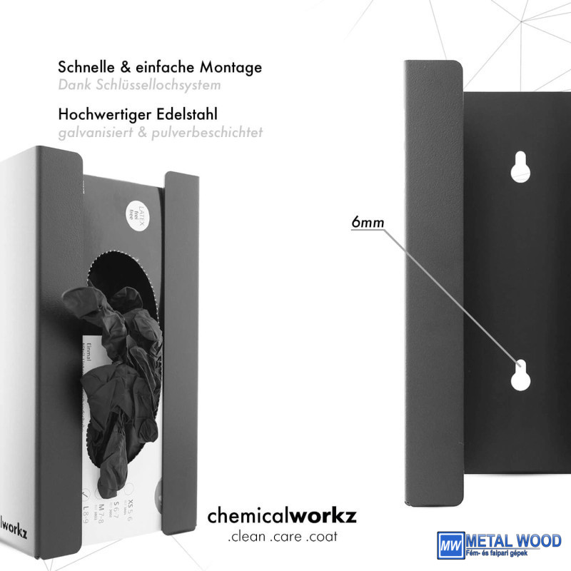 Kiváló minőségű kesztyűtartó falra szerehető. Alkalmas minden szabványos csomagolásmérethez a piacon. Precíziós vágás és hajlítás 1,5 mm-es acéllemezből, végül porszórt bevonattal, hogy extra védőréteget biztosítson a korrózió ellen. Tartós – Könnyű összeszerelés!