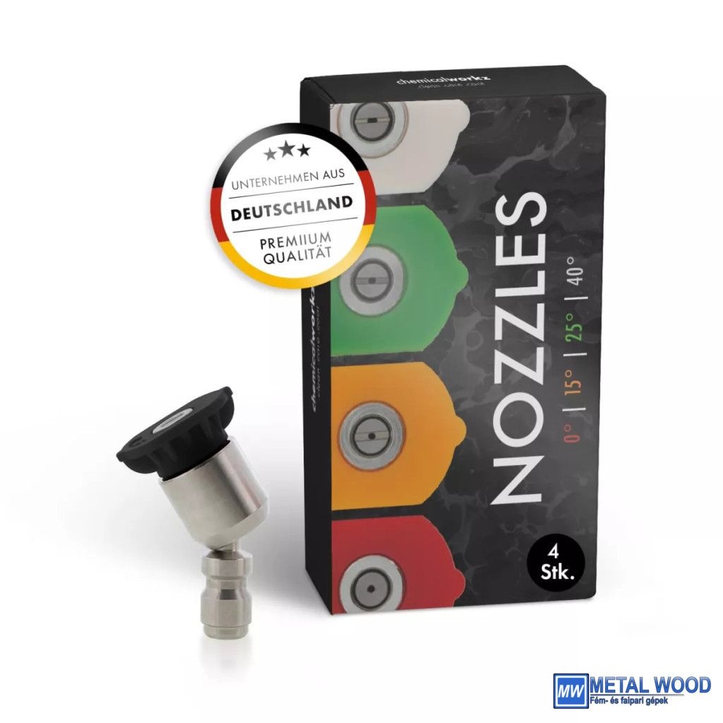 Ezek a magasnyomású mosó szórófejek kiváló minőségű rozsdamentes acélból készülnek, és tartós műanyaggal vannak megerősítve a tartósság és a korrózióállóság érdekében. Négy különböző szórási szögben kaphatók, amelyek színkódjuk alapján könnyen megkülönböztethetők: 0 fok (piros) a maximális nyomásért, 15 fok (sárga) a testrészek intenzív tisztításához, 25 fok (zöld) a széles körű tisztításhoz és 40 fok fok (fehér ) a gyengédebb felületkezelések érdekében.