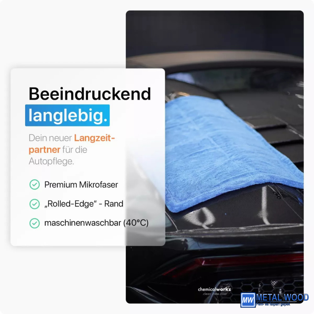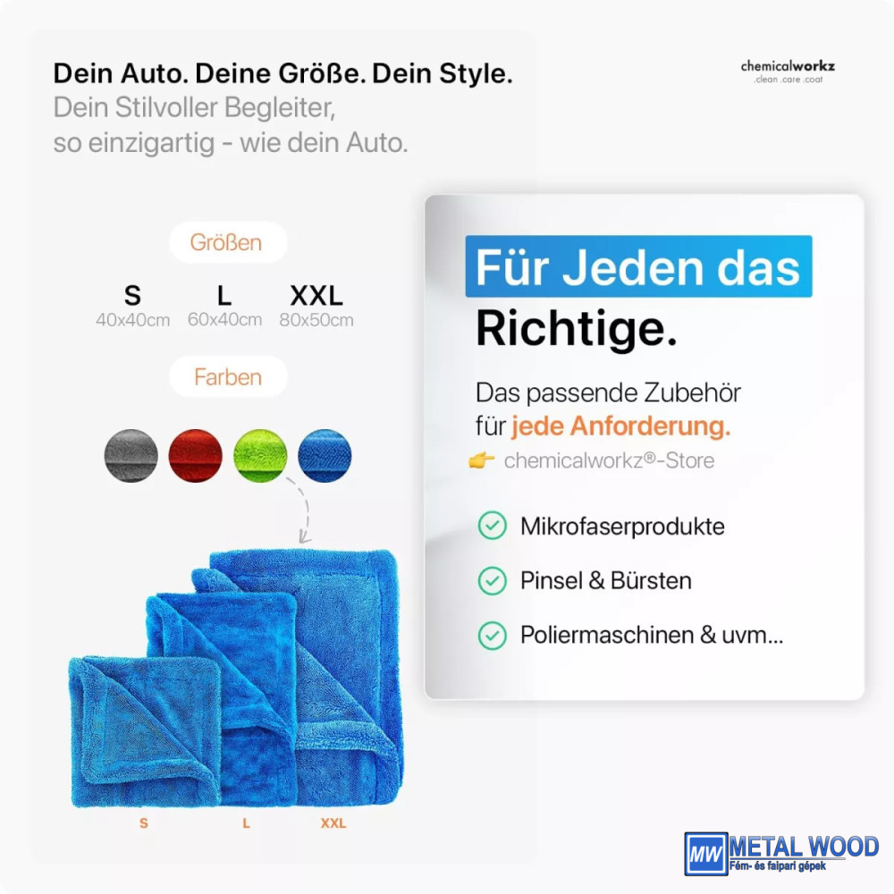 A ChemicalWorkz törlőkendők minden feladathoz magasfényű eredményeket biztosítanak. Újrafelhasználható, mosógépben mosható és környezetbarát. Tökéletes a külső felületek tisztítására vagy a szennyeződés eltávolítására a jármű belsejéből.
