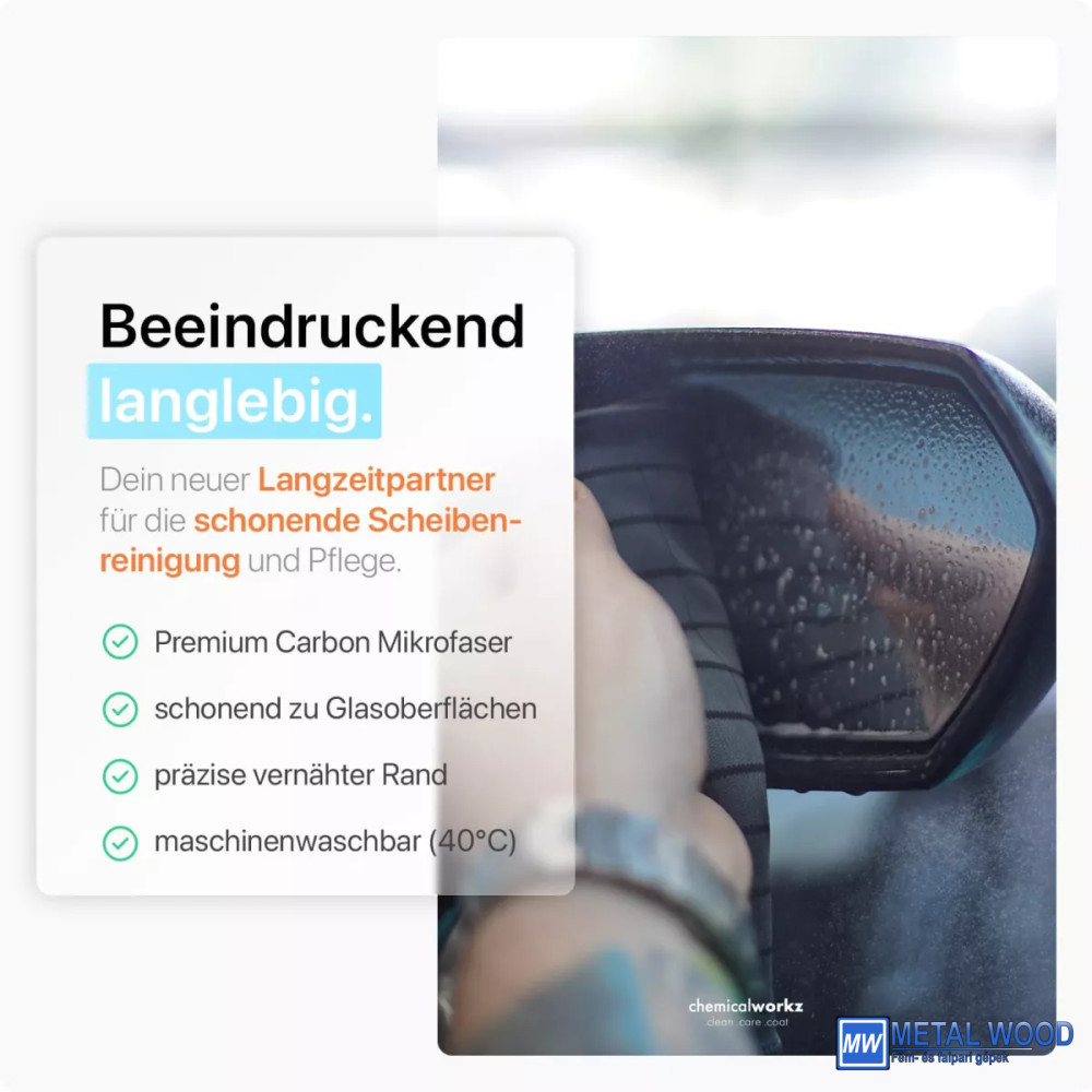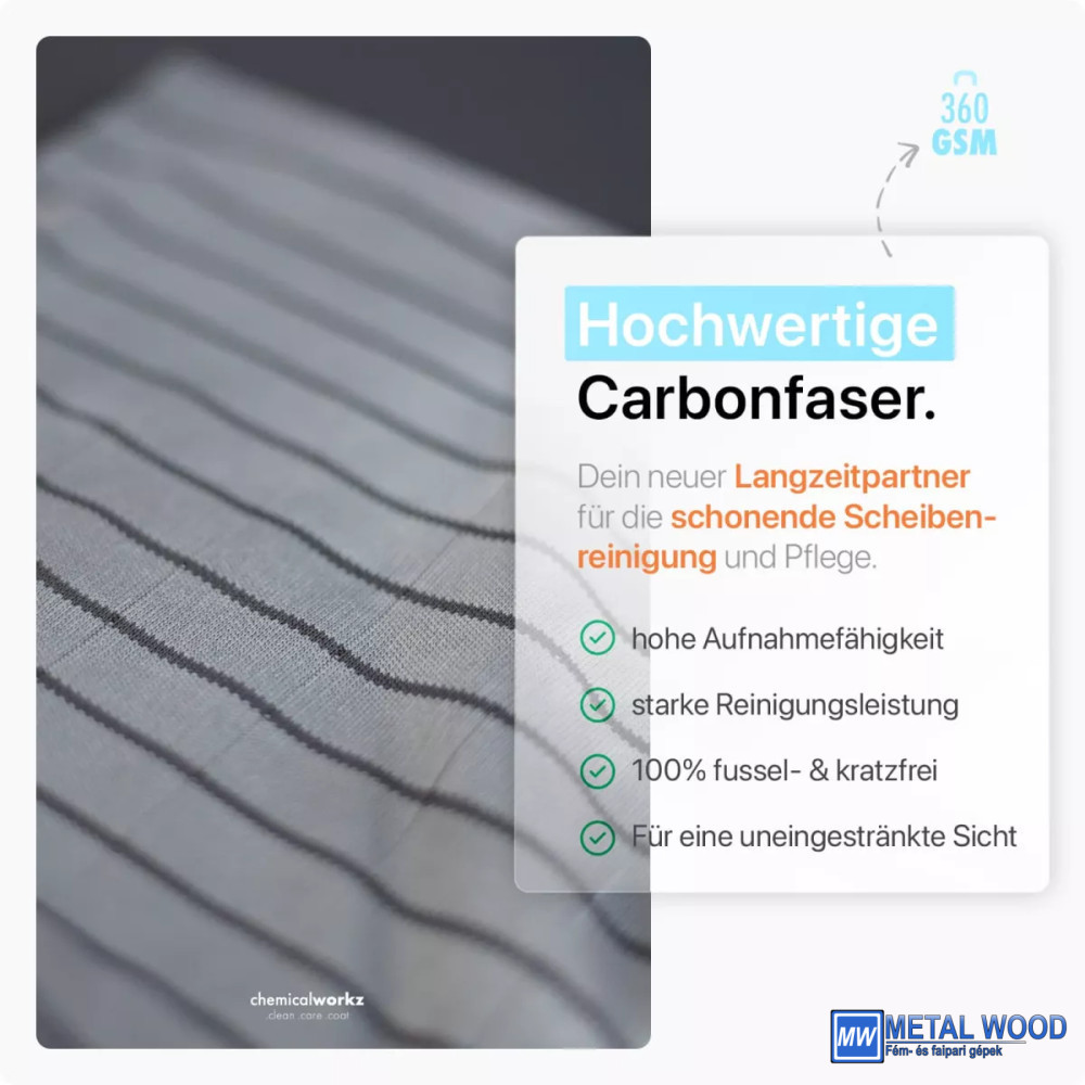 A ChemicalWorkz szénszálas üvegtörlő (nagyon) gyengén tisztító kendő, amely ideális üvegek, tükrök és sima, festett felületek tisztítására. Ezen kívül sima üveg-, króm- és fémfelületek polírozására is használható.