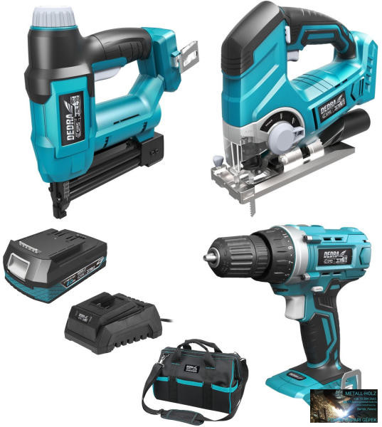 Dedra akkumulátoros fúró-csavarozó + tűzőgép + dekopírfűrész 18 V készlet (akku + töltő + táska)