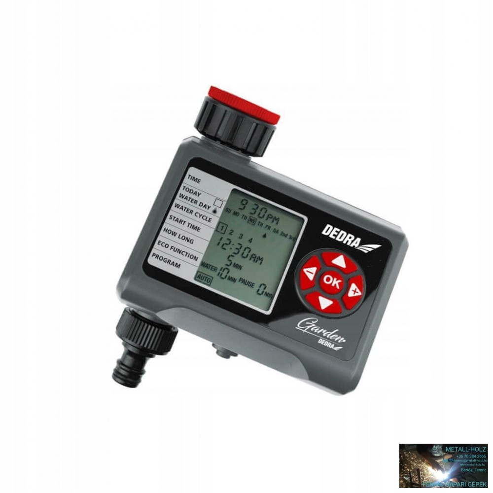A DEDRA 80N301 öntözési időzítő lehetővé teszi a kiválasztott öntözési nap kiválasztását és programozását anélkül, hogy manuálisan kellene elindítania az időzítőt. Az LCD kijelző dönthető a jobb láthatóság és működés érdekében.A termék lehetővé teszi az ECO módot, a szakaszos működés jobb és gazdaságosabb vízelosztást tesz lehetővé.