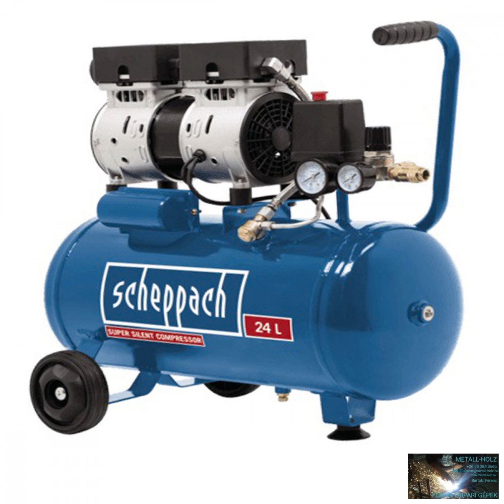 A Scheppach HC 24 Si egy csendes olajmentes kompresszor, amely alkalmas olyan helyekre is, ahol kritérium az alacsony zajterhelés. A 78 dB-es zajszintje nagyjából megfelel egy gyorsforraló forrási zajszintjének, azaz használat közben szinte fel sem tűnik, hogy a kompresszor működik. További előnye az olajmentes technológia, ami lehetővé teszi a használatot akár élelmiszerek közelében, vendéglátásban vagy lakkozó műhelyekben. Az olajmentes technológia továbbá minimális karbantartást igényel. A 24 literes tartály a sűrített levegő tárolására szolgál és a motor csak akkor kapcsol be automatikusan, ha a nyomás kívánt szint alá csökken. A tartály továbbá lehetővé teszi, hogy egy multifunkciós segítőre találjunk ebben a kompresszorban. Ennek köszönhetően, az általános fújáson kívül, pneumatikus szerszámok üzemeltetésére is alkalmas. A kompresszor két manométerrel van ellátva, az egyikkel a tartály nyomását, a másikkal a munkanyomást ellenőrizheti. Továbbá rendelkezik nyomáskapcsolóval és leeresztő szeleppel is. A markolatszár és a kerekek nagyban megkönnyítik a szállítást és mozgatást. A rezgéscsillapító talp pedig nyugodt üzemelést biztosít.