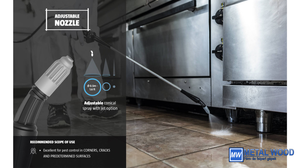 A hosszú élettartamú 18 V-os lítium akkumulátor és az ilyen típusú alkalmazásokhoz kiválasztott optimális összetevői, mint például a fúvókakészlet, a megerősített 1,5 m-es tömlő, a rozsdamentes acél lándzsa és a fogantyú, a kétállású elektronikus vezérlés az egyenletes permetezésért stb. szövetséges bármely szakember számára.