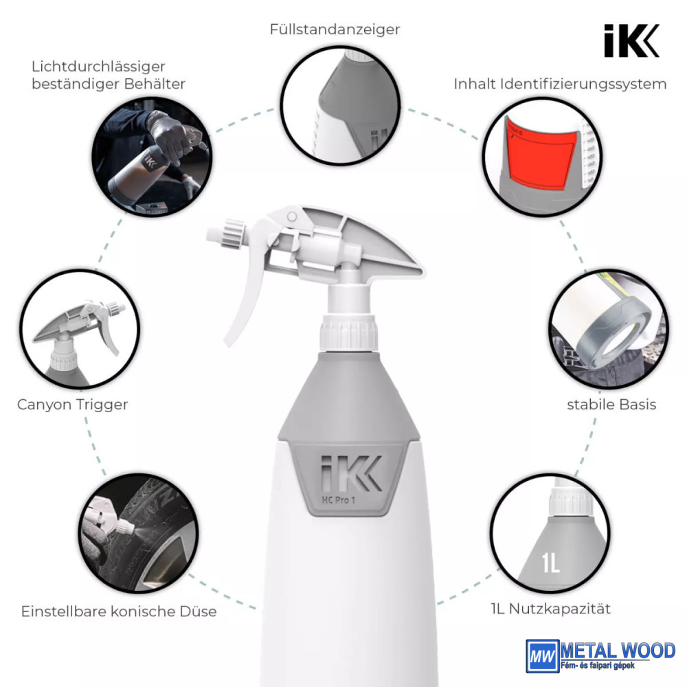 Az IK HC Tr 1 permetezőt növényi és állati olajokkal, szénhidrogén alapú oldószerekkel, kenőanyagokkal és kőolajszármazékokkal való használatra maximálisan ellenálló anyagokból tervezték és gyártották. Ideális az autóiparban való használatra olyan feladatokhoz, mint a féktisztítás, a kátránytalanítás és a karosszériafestés előtti szilikon eltávolítás. Ideális ipari alkalmazásokhoz védelemhez, zsírtalanításhoz és kenéshez, valamint fakezeléshez. Az IK HC Tr 1 egy könnyű és praktikus kioldó permetező állvánnyal a stabilitásért, színkódolt tartalomérzékelő rendszerrel és átlátszó tartállyal, amely lehetővé teszi a folyadékszint ellenőrzését a belsejében.