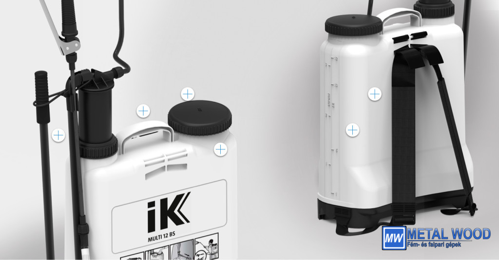 Az IK Multi 12 BS tömítései és anyagai különösen ellenállnak a legtöbb savnak, oldószernek és fertőtlenítőszernek. Tartalmaz egy megerősített 1,3 m-es tömlőt, széles töltőnyílást, állítható magasságú párnázott hevedereket, fogantyút a könnyű szállítás érdekében és két permetező fúvókát (állítható kúp és ventilátor). Áttetsző tartálya lehetővé teszi a benne lévő folyadék szintjének ellenőrzését.