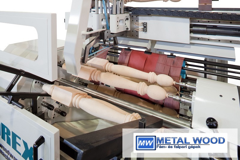 Ez egy automata hidraulikus csiszológép esztergált alkatrészekhez 8 aggregáttal. A gép alapfelszereltségként 2 x hidraulikus másolóval van felszerelve a lapos szalagcsiszoló egységekhez és mechanikusan beállított kefés hátcsiszoló egységekkel az esztergálás profilozott részéhez. A másolóegységek mozgatása hidraulikus hengerrel történik. Az alkatrészeket a ferde adagolóvezetőkbe töltik be, és a csiszolási ciklus befejezése után automatikusan kidobják a gép hátsó részén.