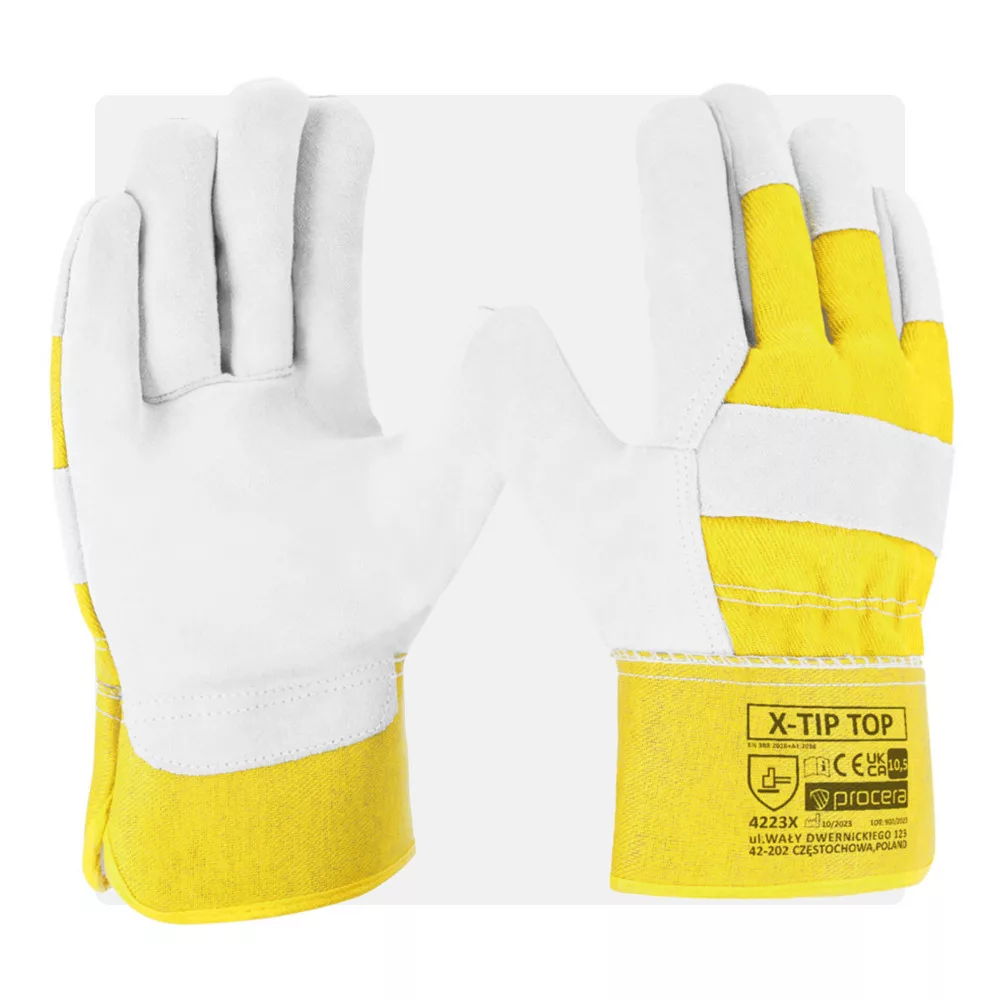 sárga vászon kézhát és kasírozott mandzsetta extra védelmet biztosít, míg a húzószalagos csuklórögzítés gyors és egyszerű illeszkedést tesz lehetővé.