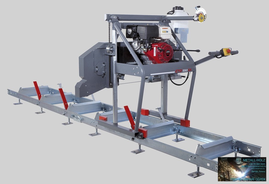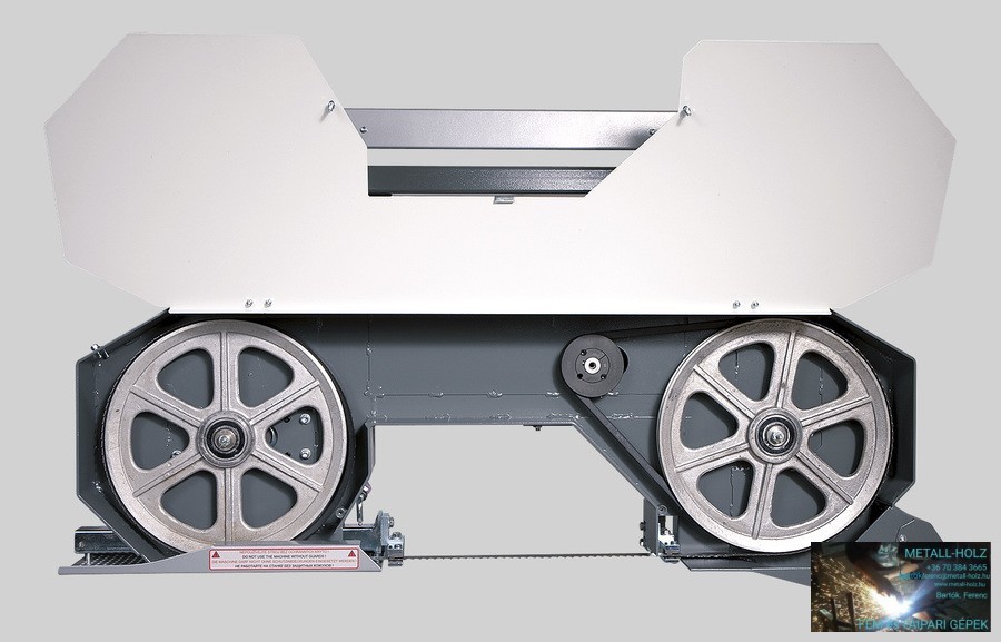 A gép teljes teljesítményét megbízható HONDA motor adja és ez garantálja az alacsony üzemeltetési költségeket és a könnyű használatot mostoha körülmények között is. Használhat akár szélesebb 35 x 0,9 mm-es bimetall fűrészszalagot is a 27 x 0,9 mm-es fűrészszalag helyett. Ez a fémipari bimetall fűrészszalaghoz hasonlóan nem igényel semmiféle élezést vagy foghajtogatást. A gépet szabványos favágó szalagokkal is felszerelheti, amelyek megegyeznek a magasabb szintű profi modellekkel. Ezekben a fűrészszalagokban a nagyobb fogak lehetővé teszik a termelékenység növelését nagy átmérőjű rönk vágásakor. A keret alumínium öntvény idler-kerekekkel van ellátva, amelyek kiegyensúlyozzák a rezgéseket. A kerék kerületén horony van. A horonyban cserélhető gumi-textil öv van, amely optimális érintkezési felületet teremt a kerék és a fűrészszalag között.
