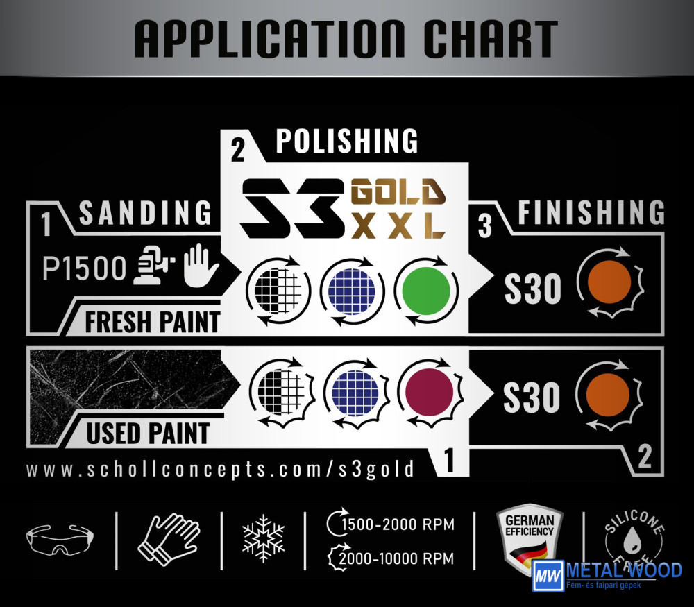 A High Performance Cutting Compound S3 Gold általában minden SCHOLL polírozó párnával használható. A legjobb eredmény érdekében javasoljuk az innovatív Sandwich-SpiderPad (fekete/fehér) vagy a rendkívül kemény SpiderPad sötétkék – a polírozóhabok legújabb generációjának – használatát.