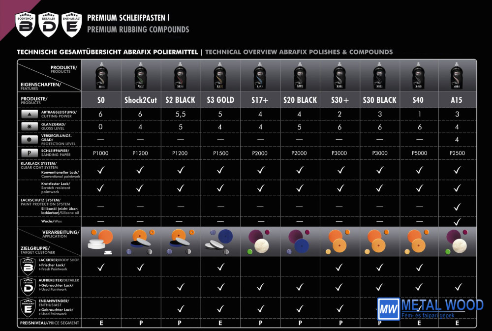 A High Performance Cutting Compound S3 Gold kifejezetten karcálló felületek festési munkáihoz készült, beleértve az UV-re keményedő festékeket is. A nagy tisztaságú alumínium-oxidon alapuló egyedülálló iPT technológiának (intelligens portechnológiának) köszönhetően most még gyorsabban és könnyebben eltávolíthatja a fedőbevonat hibáit. A kiváló szabás, a ragyogó tükörszerű fényesség és a High Performance Compound könnyű kezelhetősége meggyőzni fogja Önt.