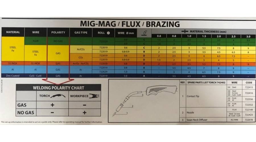 Hegesztés előtt mindössze 2 potmétert kell a megfelelő pozícióba állítani a gép belső oldalán elhelyezett színes segédlet alapján (lásd képek között), a huzaltolást, gázfolyást a gép automatikusan szabályozza ezek után.