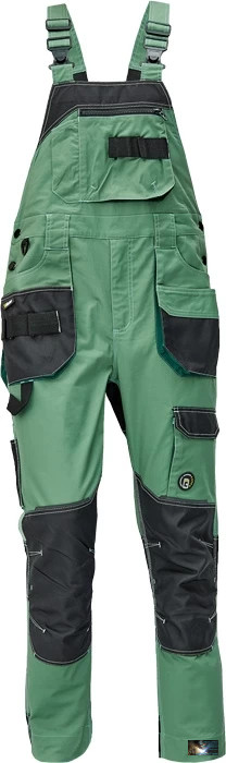 Coverguard munkaruha; erősített csatokkal állítható gumis vállpánt, oldalgombos gumizott derék, két oldal-, egy bőségráncos comb-, három szerszám-, két zárható far- és egy széles, cipzáras mellzseb, tolltartókkal három szerszámtartó heveder, biztonsági, dupla varrás végig a szár mindkét oldalán és az ülepen, derékon négy plusz tartó, melyekre szükség szerint kiegészítő zsebek, szerszámhordók tehetők, száron még 5 cm-es lehajtási lehetőség, színek: királykék (8TEBA), sötétkék (8TEBN), zöld (8TEBV), szürke (8TEBG),