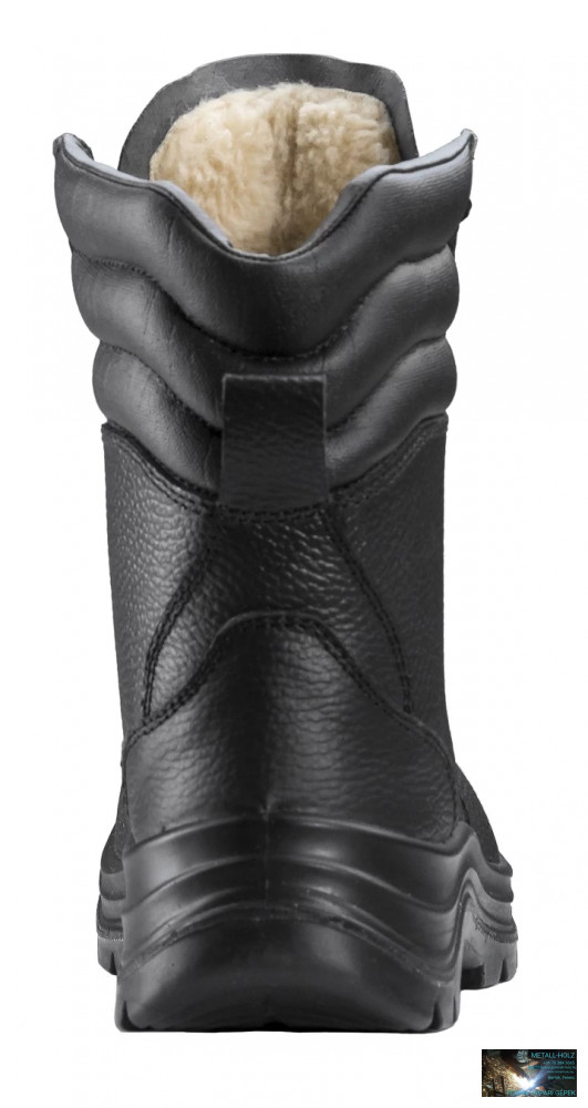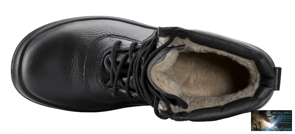 végig fűzős magasszárú fekete, víztaszító szín marhabőr felsőrész acél orrmerevítő és talplemez talpátszúrás ellen antisztatikus, olajálló, SRC csúszásmentes, kétrétegű PU talp végig izotermikus téli szőrmebéléssel, hideg elleni minősítés (CI), szivacsos szártető és nyelv, megerősített sarok és Achilles-ín védelem, fémmentes fűzőlyukak, kivehető kényelmes talpbetét, 38-47 méretig, EN ISO 20345:2011 S3 CI SRC