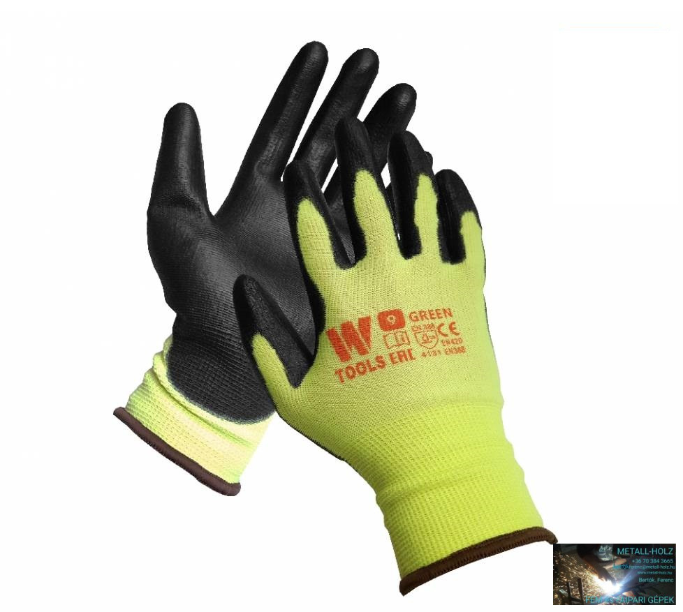 Kötött, varratmentes nylon kesztyű vékony poliuretán bevonatú tenyérrel és ujjakkal, valamint rugalmas mandzsettával.